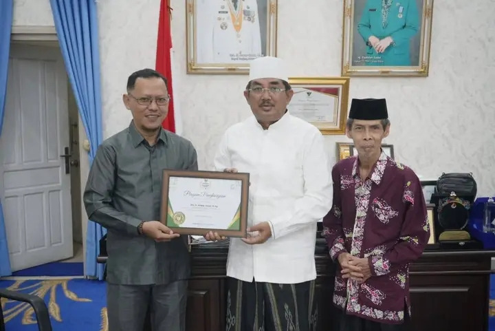 Bupati Tanjung Jabung Barat, Drs. H. Anwar Sadat, M.Ag. menerima kunjungan silaturahmi Badan Amil Zakat Nasional (Baznas) Tanjab Barat yang menyerahkan Piagam Penghargaan Baznas Awards 2025 sebagai Kepala Daerah Pendukung Gerakan Zakat Indonesia. Dalam kesempatan yang sama, Baznas juga menyampaikan laporan hasil resolusi penguatan tata kelola zakat dari Rakornas Baznas 2025 serta laporan kinerja semester I tahun 2025. Kegiatan tersebut berlangsung di Ruang Transit Rumah Dinas Bupati, Senin (8/9).